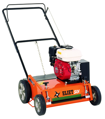 De Eliet E501 PRO is een robuuste heavy duty professionele verticuteermachine. Met lossen messen en professionele Honda motor. Geschikt voor intensief professioneel gebruik. Een verticuteermachine kamt elke vierkante centimeter van uw gazon uit. Het is dus heel evident dat de machine hierbij welke enkele steentjes aan de oppervlakte brengt. Een stevig chassis is dan ook uw directe bescherming tegen al het losgeslagen vuil. Eliet neemt op dit vlak ook geen enkel risico en kiest daarom resoluut voor een 3mm dik plaatstalen chassis dat met de precisie van robots, stevig in elkaar werd gelast. Werkcomfort betekent dat men met een minimale inspanning het werk gedaan krijgt. Hierbij legt ELIET de gebruiker van de E in de watten. Grote wielen met lichtaluminium velgen voorzien van twee grote kogellagers. Deze 'heavy duty' wielen zijn bestand tegen de stoffige omstandigheden waarin deze machines moeten werken. Het brede loopvlak van de wielen verkleint het risico op spoorvorming bij natte gazons. Uitgevoerd mes vaste messen en Honda GX200 6,5PK motor.